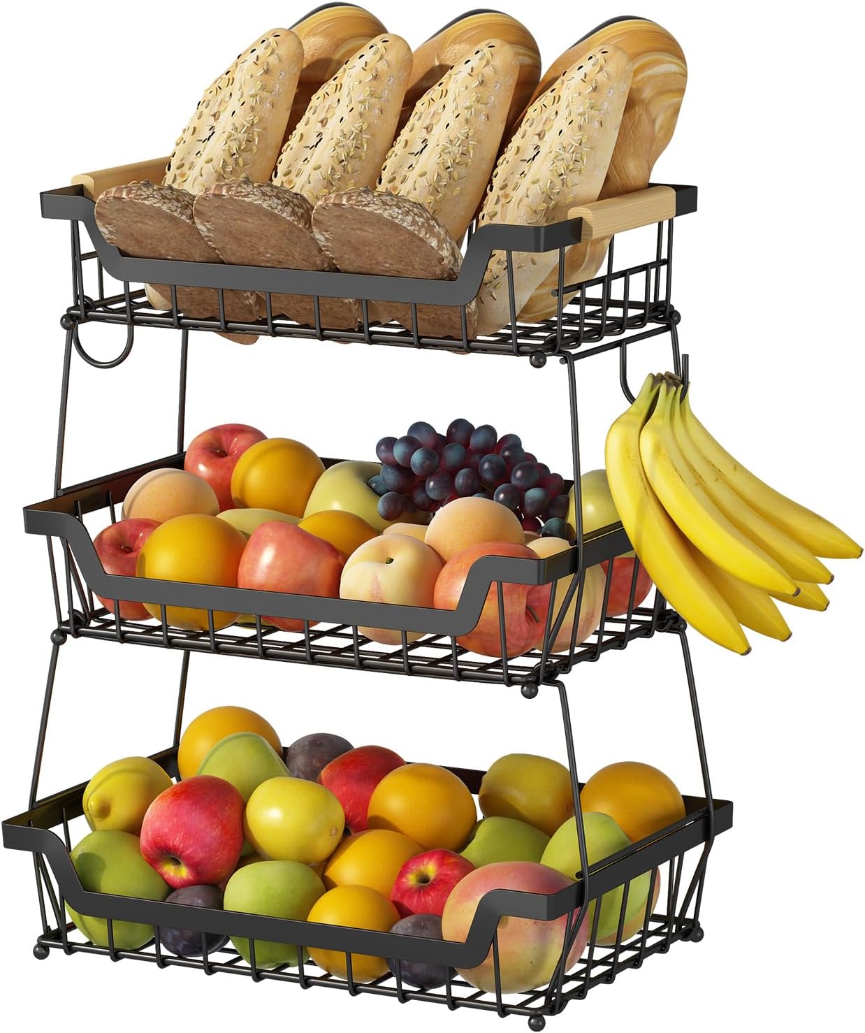 GILLAS 3 Tier Countertop Fruit Basket with 2 Banana Hangers for Kitchen, Detachable Metal Organizer for Bread Vegetable Fruits with Wooden Handle, Large Capacity Rectangular Storage Stand Bowls, Black